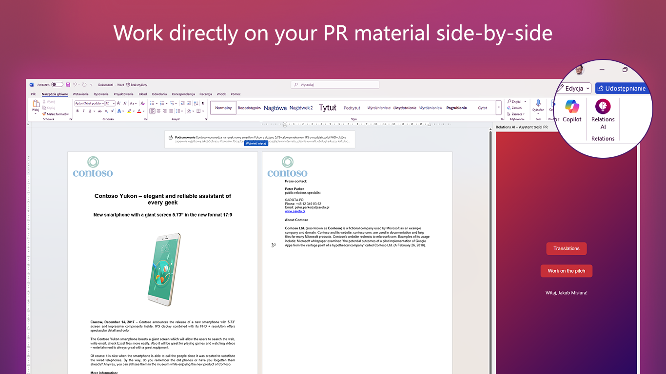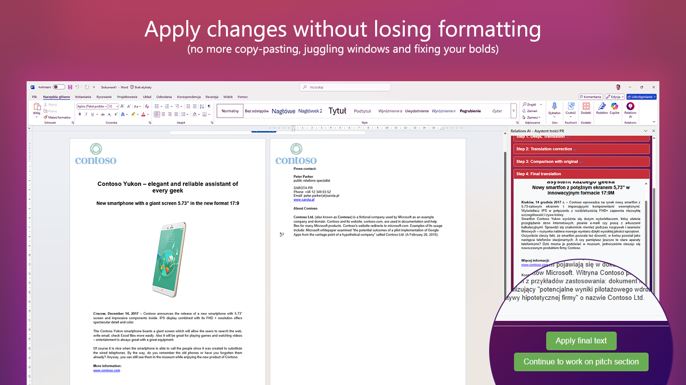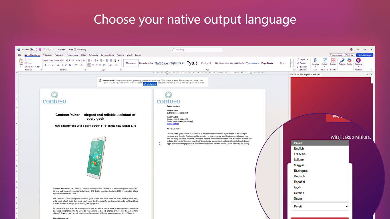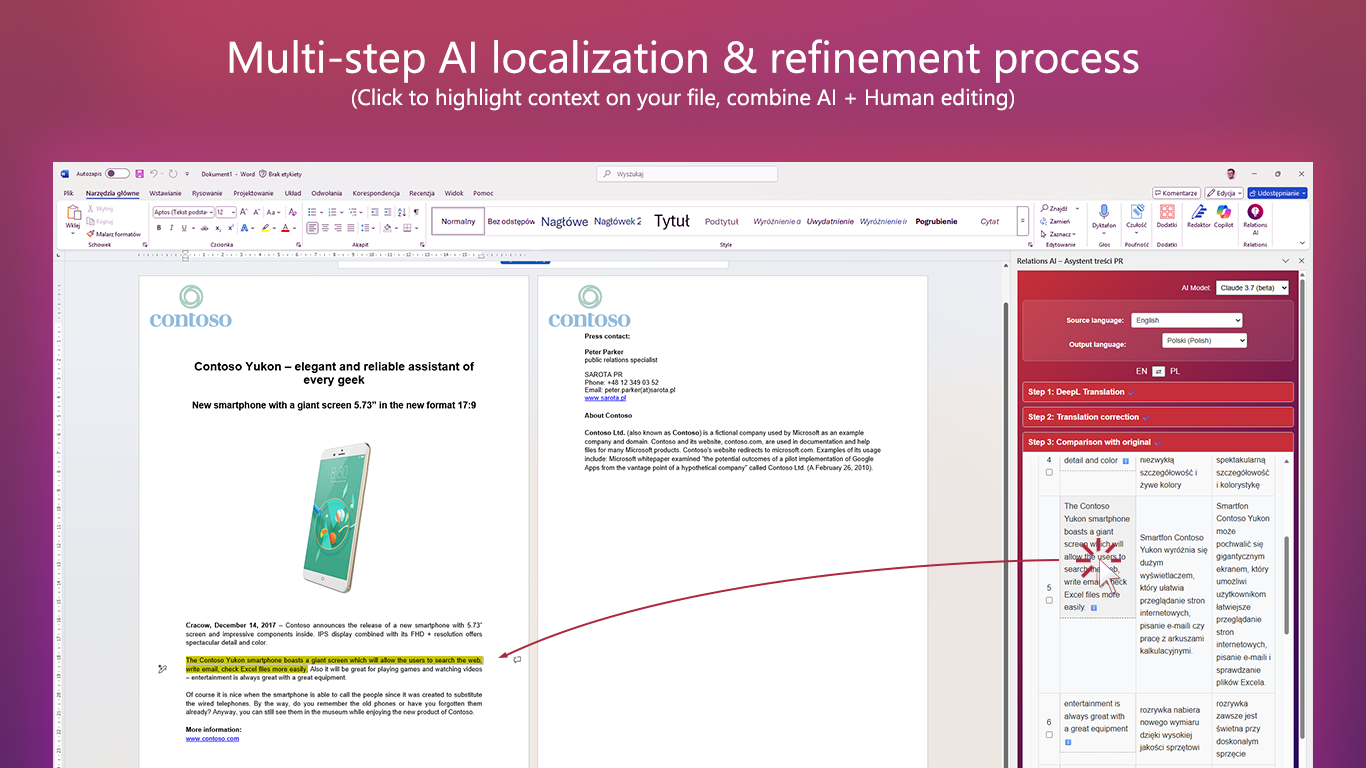 Tłumaczenia, analiza i redakcja tekstu, generowanie tytułów oraz wygodne szablony – prosto w Microsoft Word i w przeglądarce. Z zachowaniem standardów bezpieczeństwa Twojej agencji.